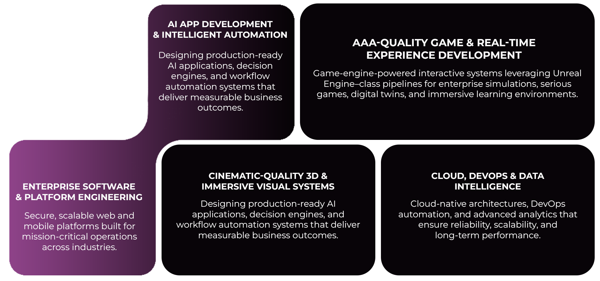 We operate at the intersection of Artificial Intelligence, Advanced Software Engineering, Cinematic-quality 3D, and AAA-level Game Technology, enabling organizations to transform complex operations, training, visualization, and customer engagement into intelligent, interactive, and scalable digital ecosystems.